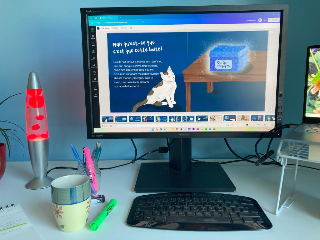 Dans les dernières semaines, je mis mon énergie sur la mise en page. Je ne partais pas de zéro, puisque j’avais déjà créé une maquette avant de faire les illustrations. Je suis donc partie de celle-ci, pour rassembler les images et le textes dans les pages de l’album. Il y a eu un peu de va et vient, d’ajustement dans les illustrations, d’ajouts, etc… Des trucs normals!! Mais dans l’ensemble, tout s’est super bien passé!