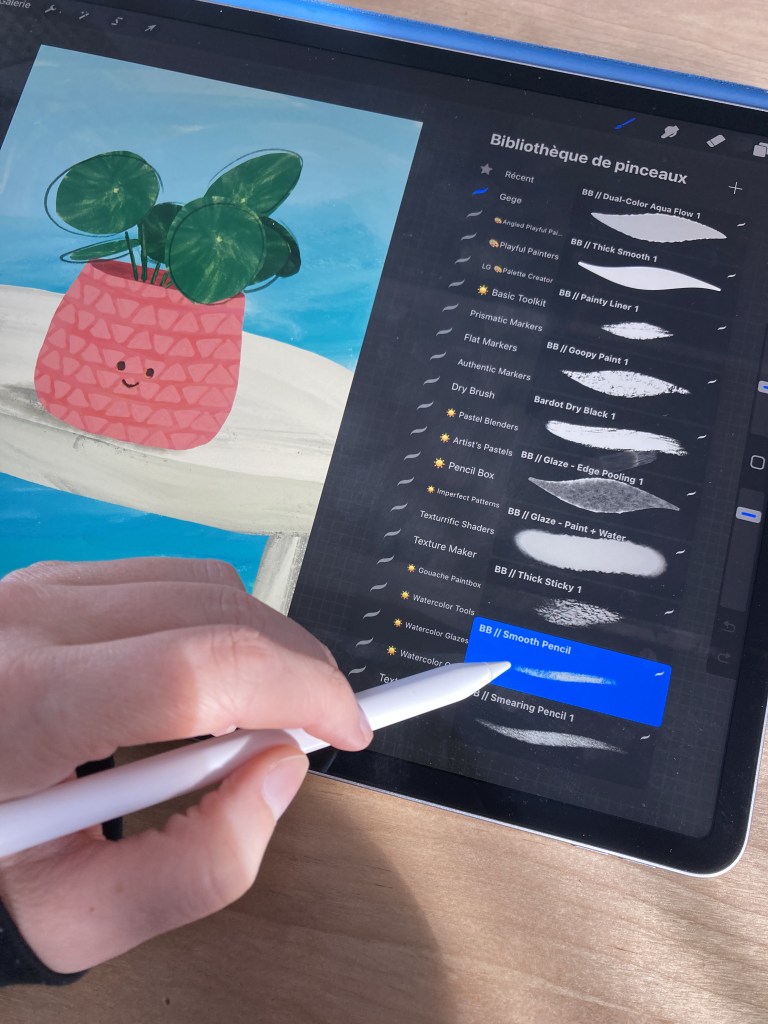 Je termine donc cette étape avec une palette de couleur et les pinceaux à utiliser que j’utiliserai comme une recette pour créer mes illustrations à la prochaine étape!