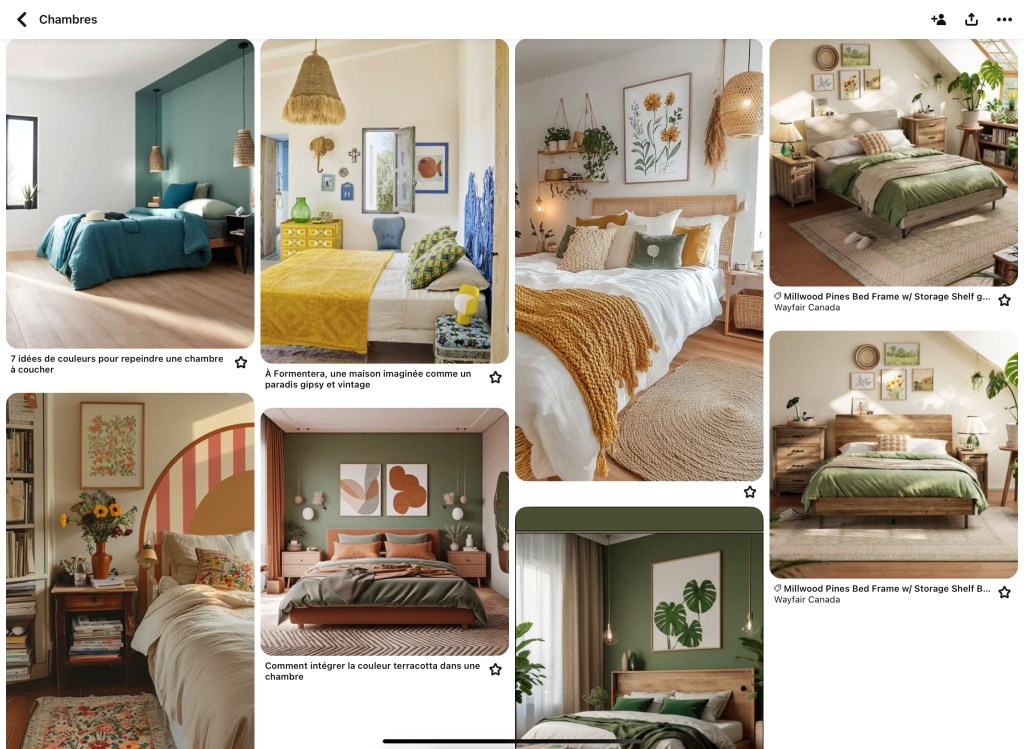 Pour m’inspirer, je recherche des images sur Internet pour m’aider à bien placer les éléments dans le décor de mes scènes. Comme mon livre se passe dans une chambre, j’en ai trouvé plusieurs sur ce thème. Ces images m’aident avec la perspective et les différents points de vue des éléments.