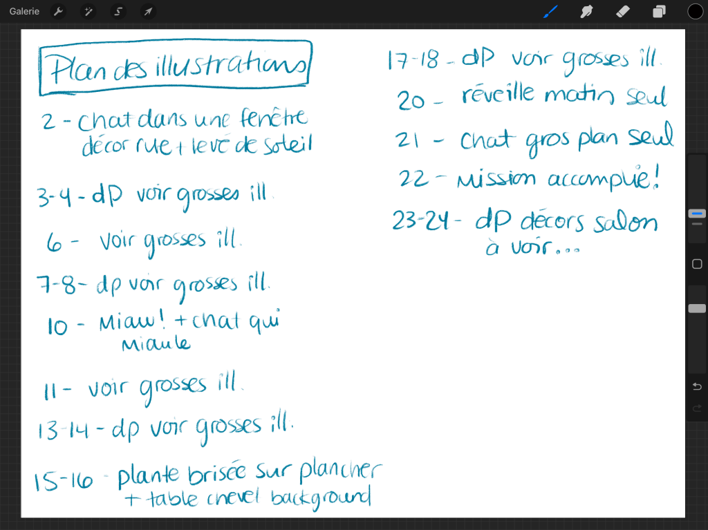 Sur papier c’est très facile, mais dessiner les illustrations pour un album au complet, ça prend beaucoup de temps!! Et même si j’ai un background en arts visuels, je me rends compte avec l’expérience que dessiner me demande beaucoup plus d’énergie que d’écrire. Mon objectif : une double page par semaine.