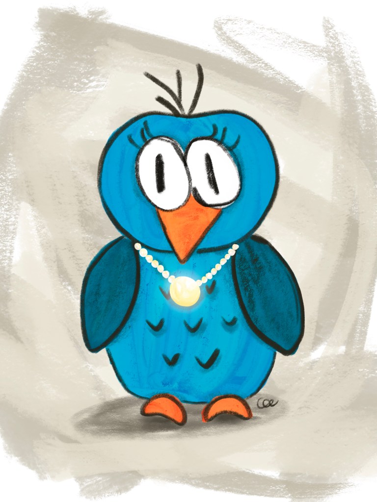 Voici Chou. Chou est un hibou qui adore créer plein de choses. Justement, pendant la fin de semaine, il a créé un très beau bijou! Un collier coloré et scintillant, en ne choisissant que ses plus belles perles. Il en est très fier et a vraiment hâte de le montrer à ses amis Joujou et Caillou ce matin à l’école.