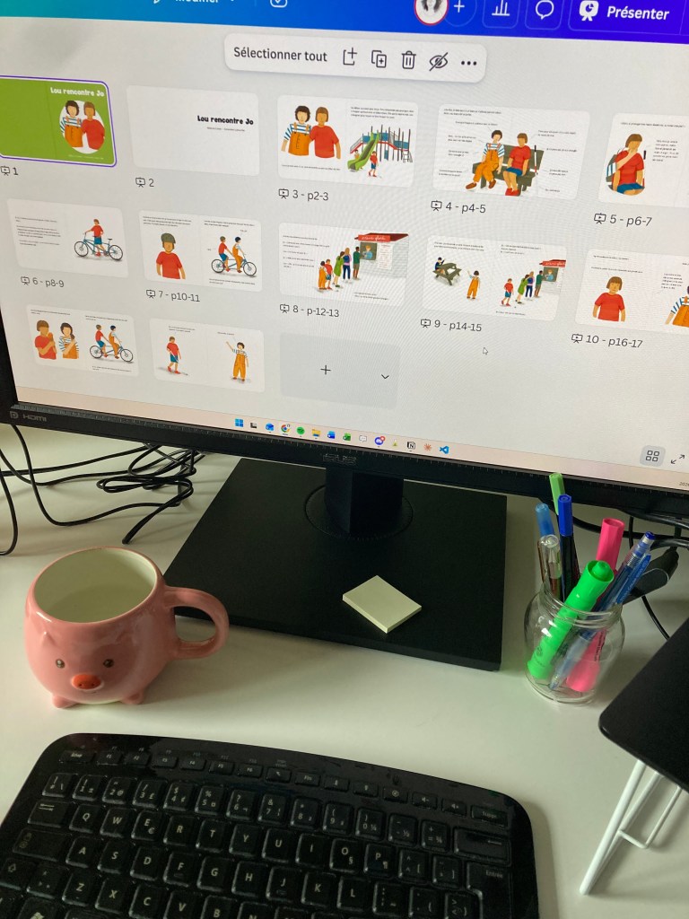 Ce projet-là est différent de mes albums habituels. Je fais les illustrations et la mise en page, mais l’histoire n’est pas la mienne — c’est celle d’une auteure qui est aussi ergothérapeute. Ça change la dynamique! D’habitude je contrôle tout de A à Z, mais ici c’est un travail d’équipe.
