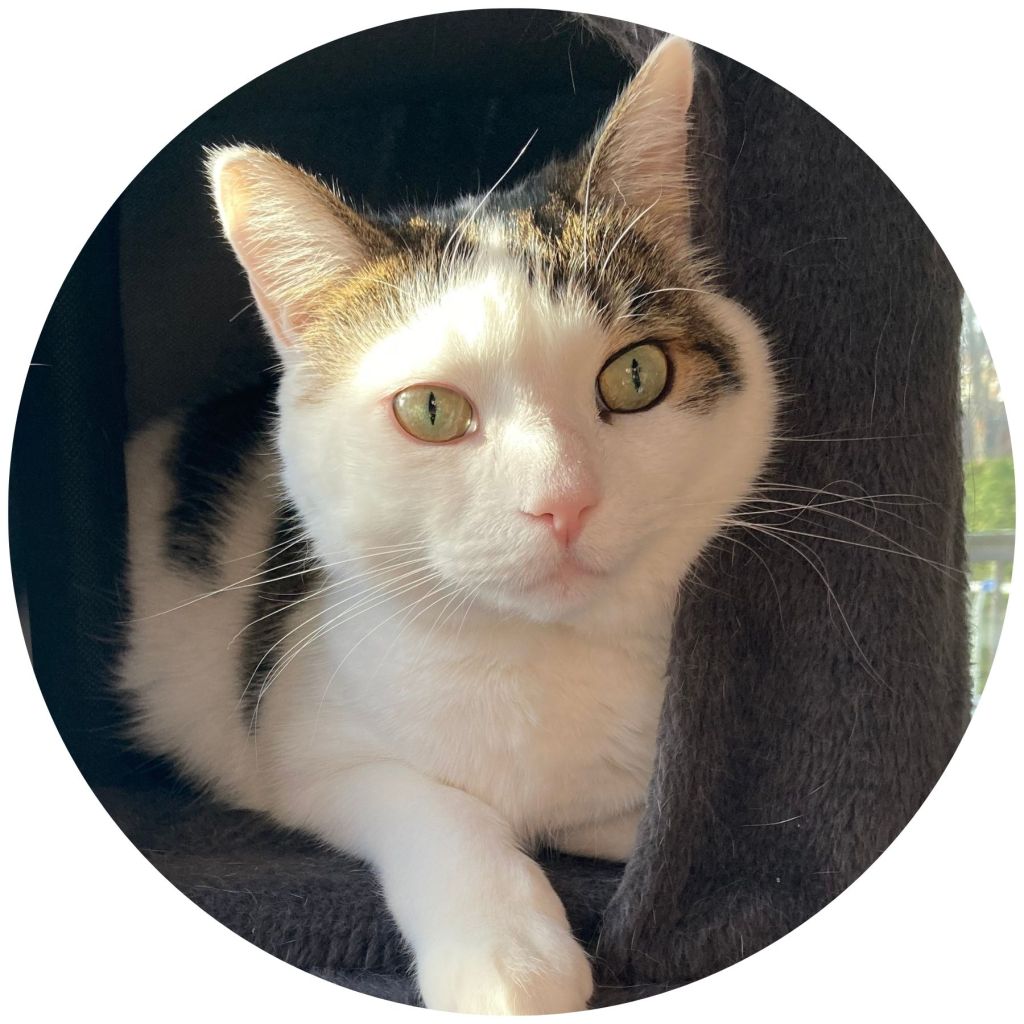 Si on ne se fiait qu’à son visage, on aurait l’impression qu’elle est toujours fâchée. Mais sous cette façade se cache une petite chatte très ronronneuse qui adore se faire gratter les joues et dormir collée-collée toute la nuit. Petite et agile, elle n’hésite pas à se défendre quand son frère chat Flocon la prend en chasse. Elle préfère passer ses journées au grand air et souffre de dépression saisonnière à l’arrivée des grands froids d’hiver.